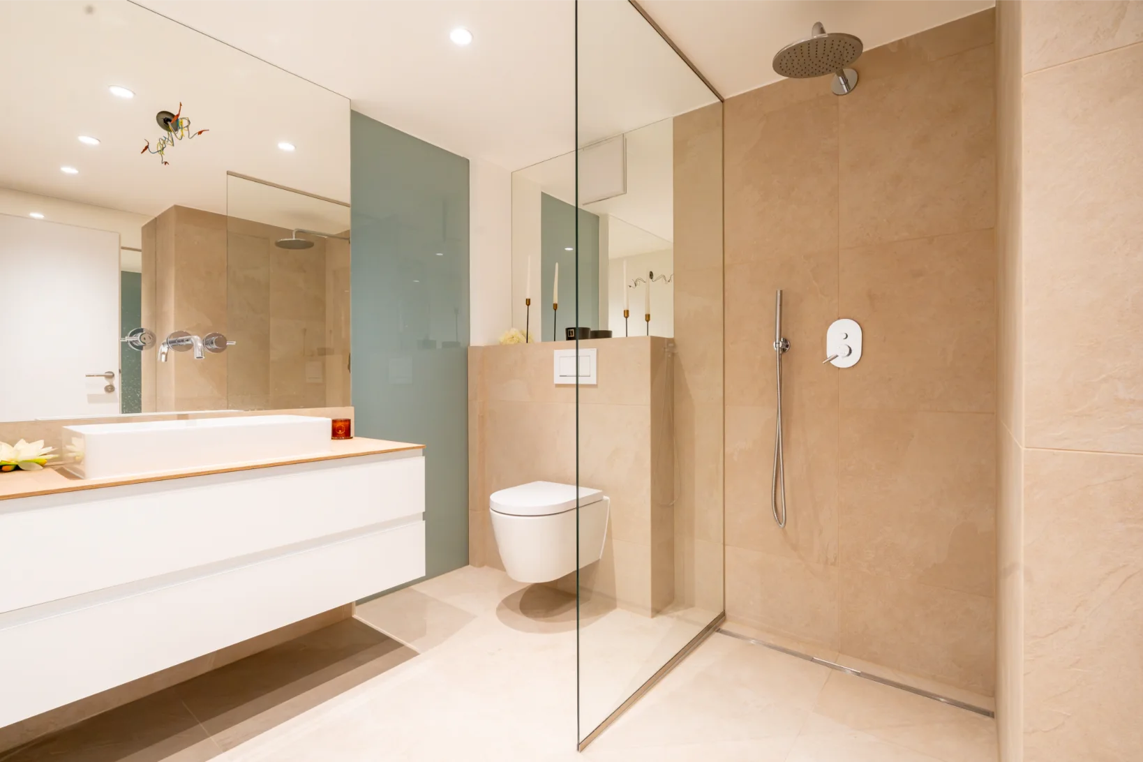 Das erste Schlafzimmer grenzt direkt an den Wohnbereich und verfügt über ein eigenes Badezimmer mit Dusche, Doppelwaschbecken und WC.