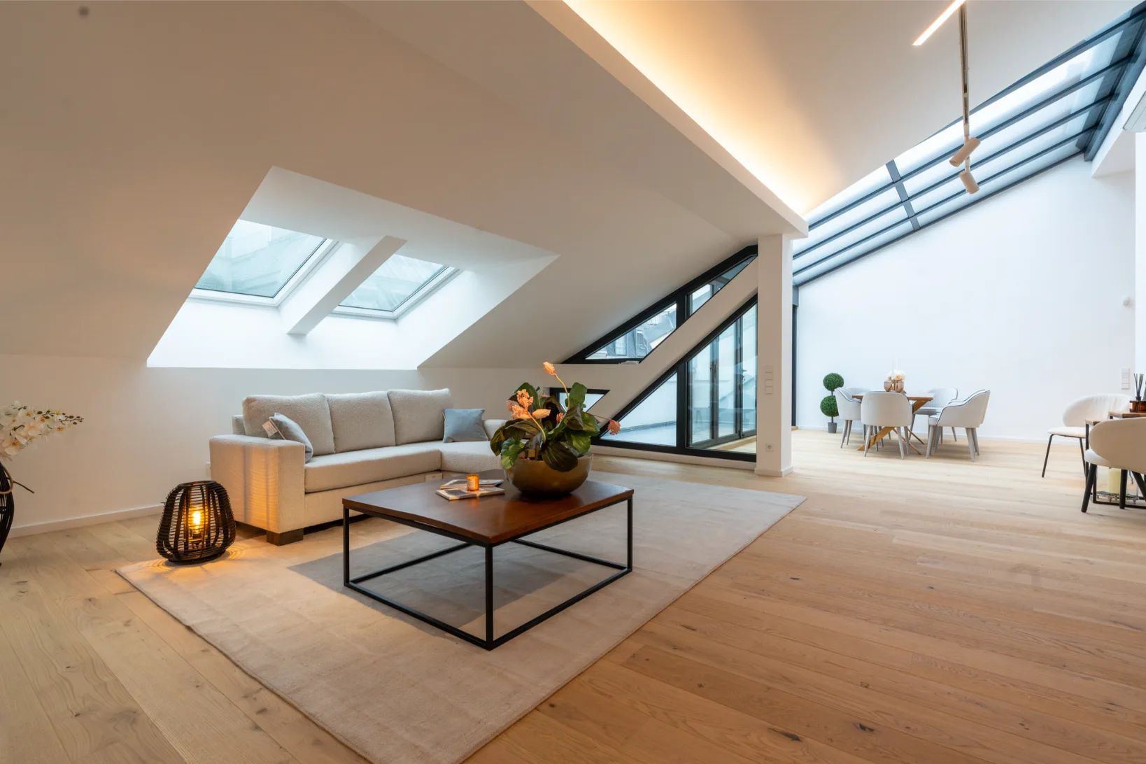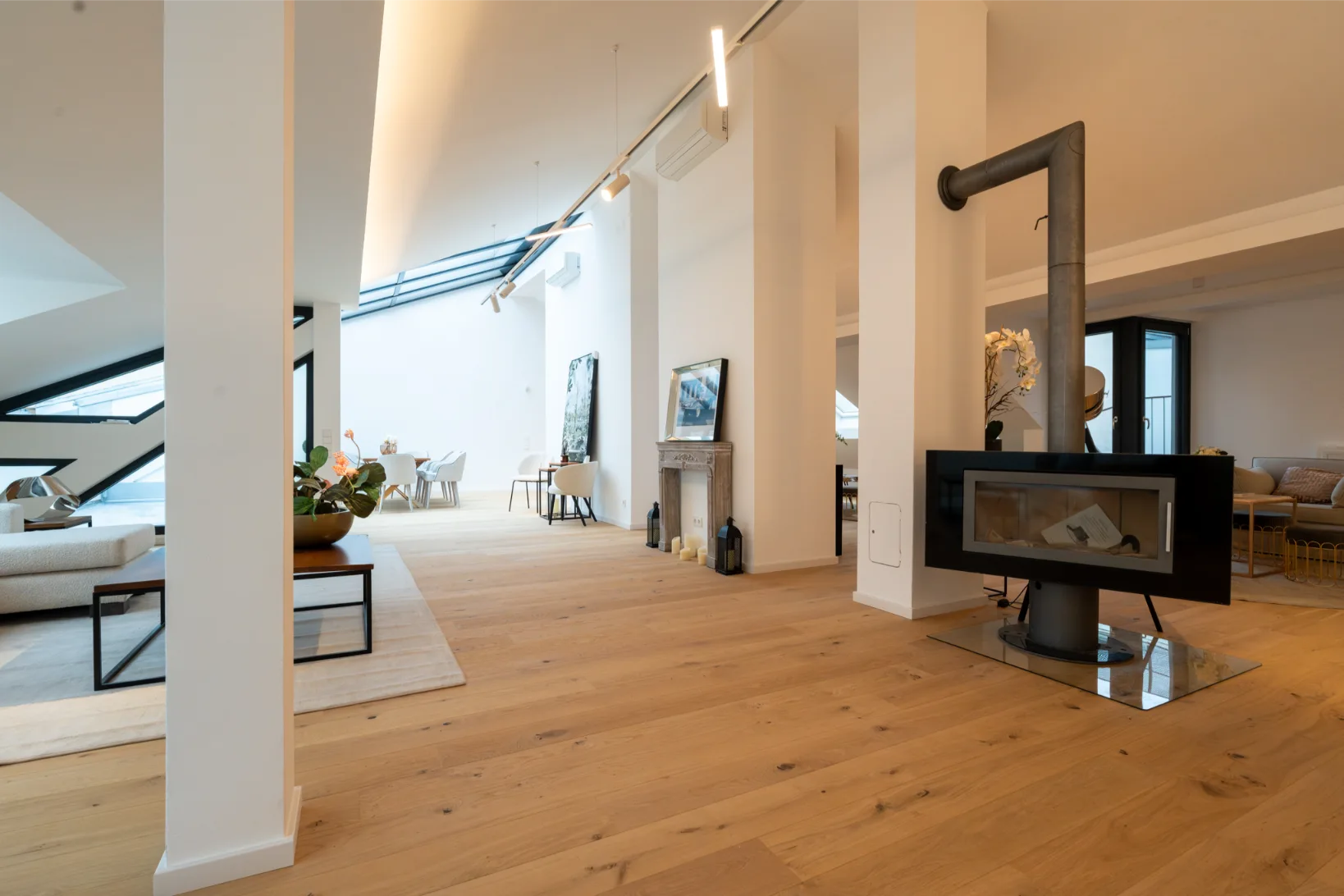 Die offene Raumgestaltung mit beeindruckend hohen Decken verleiht dem Wohnbereich eine außergewöhnliche Loft-Atmosphäre. Das Wohnzimmer ist durch eine elegante Zwischenwand dezent gegliedert, sodass Koch-, Ess- und Wohnbereich harmonisch ineinander übergehen. Ein besonderes Highlight ist der komplett öffenbare Balkon, der selbst im geschlossenen Zustand einen freien Blick in den Himmel ermöglicht. Ein großer, drehbarer Kamin sorgt zusätzlich für eine besondere Wohnatmosphäre.