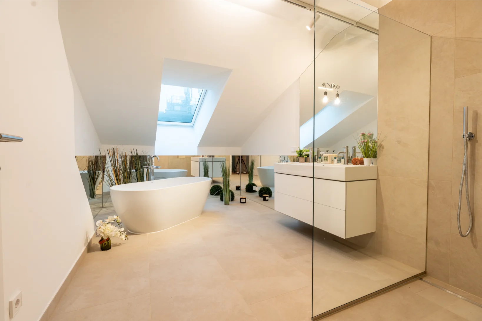 Über eine Treppe gelangt man in das obere Stockwerk, wo sich der private Spa-Bereich befindet – ideal für den Einbau einer Sauna, Fitnessgeräte oder eine Wellness-Lounge. Anschließend befindet sich der Wirtschaftsraum. Von hier aus besteht zudem die Möglichkeit, auf die Dachterrasse zu gelangen und einen einzigartigen Weitblick über Wien zu genießen.